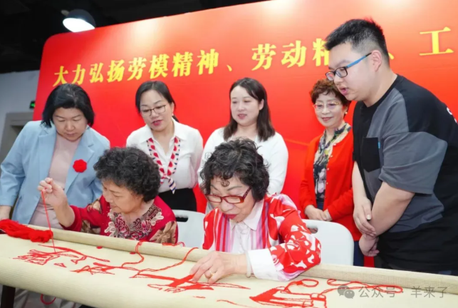 五位在不同领域发光发热的劳模会聚现场,以坚守与创新诠释责任担当。扎根社区二十载的徐丽华,带领团队创下旧改 “双百奇迹”,推广 “宝兴里群众工作十法”;被誉为“新疆十大女杰”的赵兰英 15 岁支边新疆,在通信岗位深耕 40 年,退休后加入上海百老德育讲师团,奔波于校园社区宣讲支边故事,用一生坚守诠释 “献了青春献终身” 的劳模精神;从环卫设备维修 "新兵" 蜕变为 "劳模创新工作室" 技术攻坚核心的王晓洋,以 24 年专注环卫设备维修,用创新技术赋能城市管理;被居民称为 “靠谱” 的 “小巷总理”的崔佩生扎根社区二十年,以 “微福居” 等举措推动基层自治;刘美珍作为环卫驾驶员,创新作业方法,传帮带教彰显党员担当。他们以各自的方式践行初心,书写时代华章。此次,他们来到恒源祥集团,一同为“百年工运”非遗作品献上一份爱。正如恒源祥集团党委书记顾红蕾在欢迎词中说道:各位在座的劳模是工运精神的生动写照。当你们亲手制作“百年工运”这幅作品时,手中的非遗技艺将成为讲述劳模故事的“新语言”。