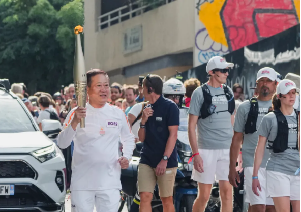 2024年5月13日,刘瑞旗院长在法国蒙彼利埃作为巴黎奥运会首位中国火炬手传递奥运圣火
