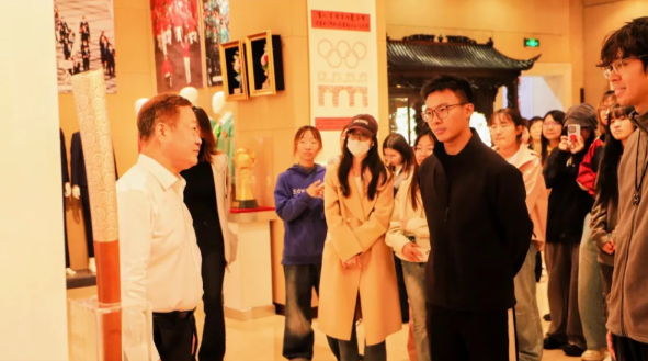 参观之前,刘瑞旗院长分享并解读了自己在15年前为公司写下的话:“成为历史的一部分;无我,无限,无中生有;持续为社会创造价值。” 他以自身的品牌实践经历为例,让同学们意识到,一个品牌想要长久发展,就必须积极融入更广阔的历史文化脉络中,创造出独特且有意义的价值。参观过程中,结合历届奥委会主席绒绣像、奥运火炬、徽章,冬奥会颁奖花束以及与奥林匹克相关的服装和礼品等,刘瑞旗院长向同学们解读了恒源祥与奥林匹克的深厚缘分。这些展品生动地表现出恒源祥对奥运的持续支持,也展现了恒源祥作为中国品牌的独特魅力和文化自信。