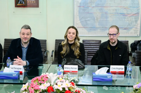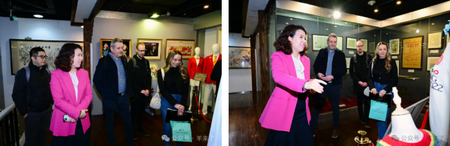 伯明翰大学全球高级客户经理Brittany Kennan、伯明翰大学创意媒体总监Lee Flanaghan、伯明翰大学内容制作专家Chris Mogridge在集团公益慈善中心总监、伯明翰大学校友王晓懿的陪同下先参观了恒源祥文化艺术展厅,初步了解恒源祥品牌发展历程、体育文化、公益事业以及非遗传承与创新成果。