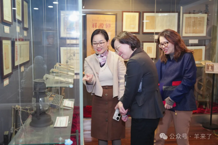 在顾红蕾书记的陪同下,来访嘉宾首先参观了恒源祥文化艺术展厅。顾书记详细介绍了恒源祥品牌的发展历程,特别是在体育赞助、奥运支持、公益慈善及非遗传承保护等领域取得的丰硕成果。