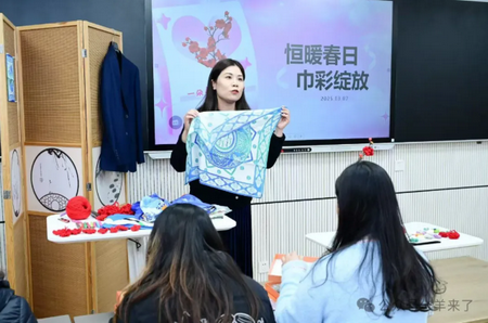 杨维珍带来了以“恒暖春日,巾彩绽放”为主题的活动课。她首先介绍了恒源祥服饰为广大教师量身定制的教师服。此次定制的服装不仅融合了恒源祥的传统工艺与现代时尚元素,更考虑到了教师职业的特点和需求,展现出教师们的优雅气质和专业形象。同时,为了增添节日氛围,恒源祥还特别为黄浦区实验中学定制设计了蓝绿丝巾,作为搭配教师服的精美配饰。