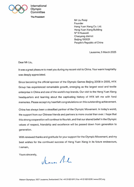 再次感谢您对奥林匹克事业的支持,愿恒源祥辉煌永耀。