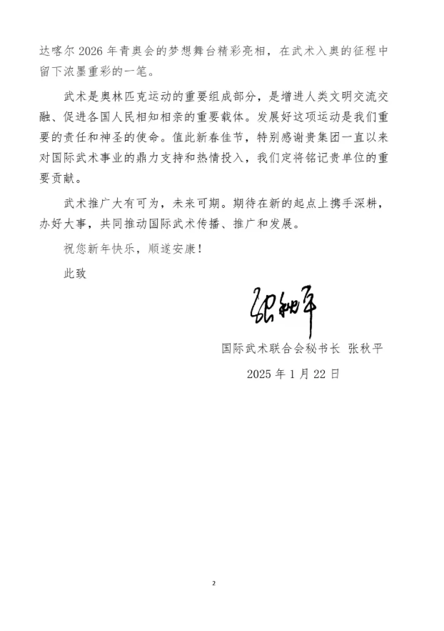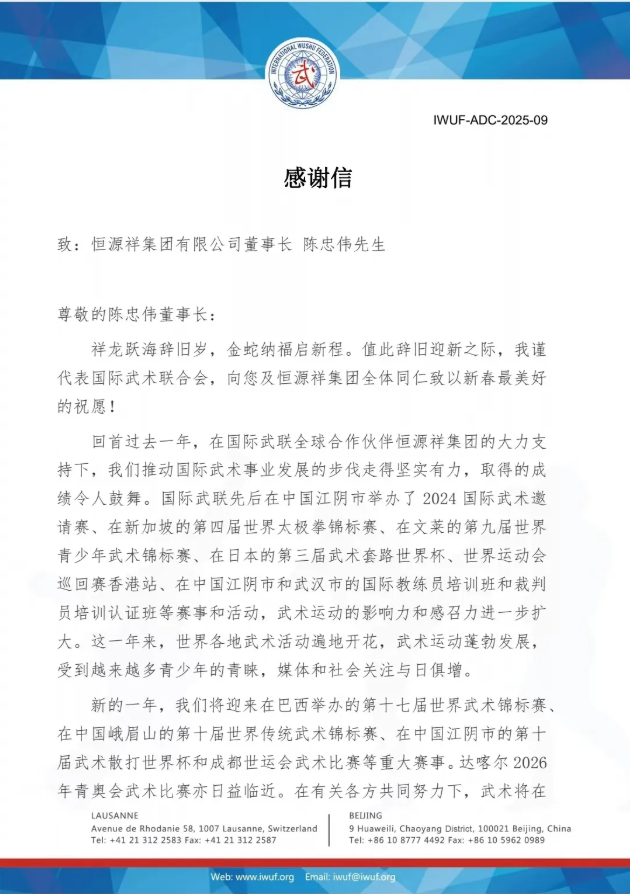 国际武术联合会秘书长张秋平致陈忠伟董事长的感谢信