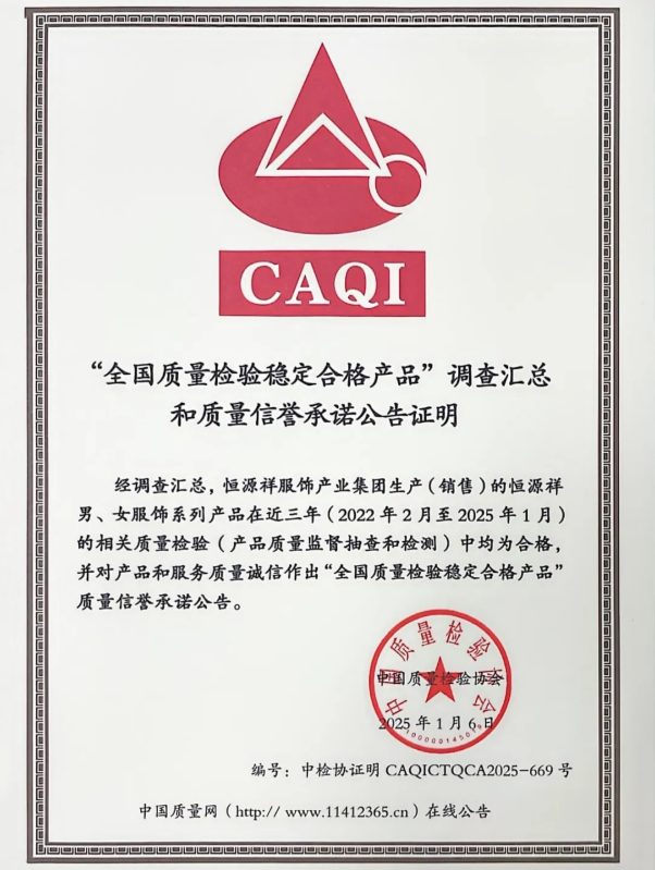 经调查汇总,恒源祥服饰产业集团生产(销售)的恒源祥男、女服饰系列产品在近三年(2022年2月至2025年1月)的相关质量检验(产品质量监督抽查和检测)中均为合格,并对产品和服务质量诚信作出“全国质量检验稳定合格产品”质量信誉承诺公告。