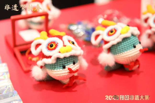 其中最受游客欢迎的是由海派绒线编结技艺制作的蛇年生肖玩偶,俏皮的的小蛇吐着鲜红的舌头,头上还带了顶龙头帽,非常俏皮可爱,且年味十足。