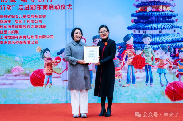 活动现场还举行了“恒源祥公益慈善杰出实践店铺”的颁奖仪式。为了表彰和鼓励在恒源祥联合体中践行品牌ESG理念以及核心价值观杰出的产业终端,顾红蕾书记为贵州省凯里市清江岗亭恒源祥家纺颁发了“恒源祥公益慈善杰出实践店铺”的证书,柳丹丹作为代表接受颁奖。