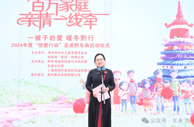 随后,恒源祥集团党委书记、妇联主席顾红蕾发表讲话。她用一根“红色的线、温暖的线、创新的线”来诠释“恒爱行动”在贵州开展的历程,以及此次走进黔东南与家纺产业特别推出的创新举措,例如在店铺设置“恒爱驿站”、贵州省花杜鹃花“恒爱亲巧包”、“旧物新生 爱心传递”项目,鼓励大家捐赠旧纺织品,实现资源的循环再利用,同时也传递了绿色生活的理念。