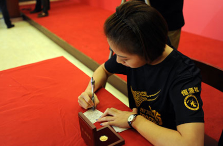 为了答谢广大关注、支持恒源祥藏羚羊保护事业的消费者,在上海市卢湾公证处见证下,眭禄抽取了25名2015羊毛嘉年华活动中“88”金币中奖者,并亲自在编号001的金币收藏证书上签名。