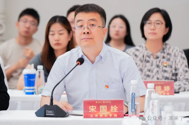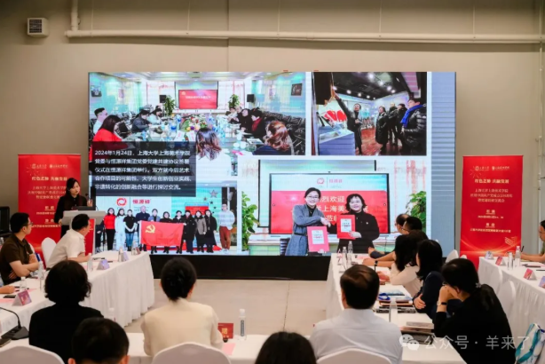 在党建联建成果介绍环节,国油版雕党支部、建筑系党支部、设计系党支部分别展示了党建工作中的创新实践。通过生动的合作案例,展示了在学科交叉、技术融合、美育辐射、美育浸润、人才培养等方面,党建工作与专业特色深度融合的共建成果。其中,也呈现了自2024年1月上海大学美术学院党委与恒源祥集团党委签署党建共建协议以来,双方就艺术设计、非遗转化、海派融合等方面进行的探讨与创新实践。