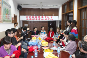 2012年10月22日 重阳节前夕,集团青年党员、青年志愿者们为宝兴社区的“纳保”老人编织爱心围巾,送上节日祝福。