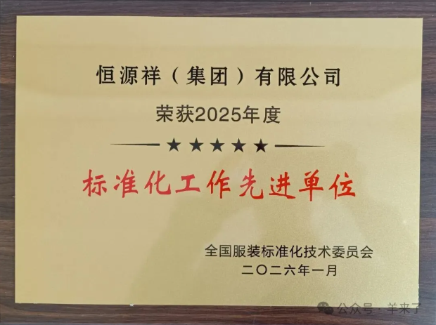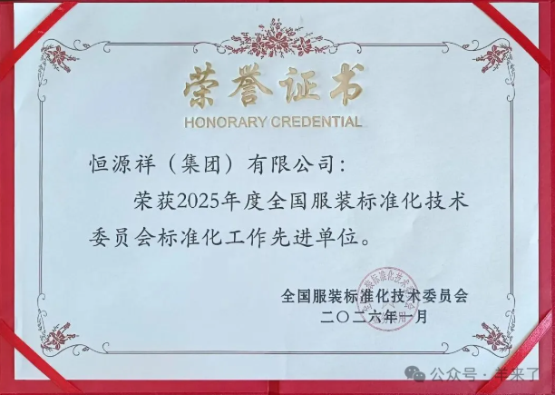此外,为鼓励先进,树立典型,大会对在推动服装标准化事业健康发展方面做出突出贡献的单位和个人进行了表彰。恒源祥(集团)有限公司被全国服装标准化技术委员会授予“2025年度标准化工作先进单位”荣誉称号。
