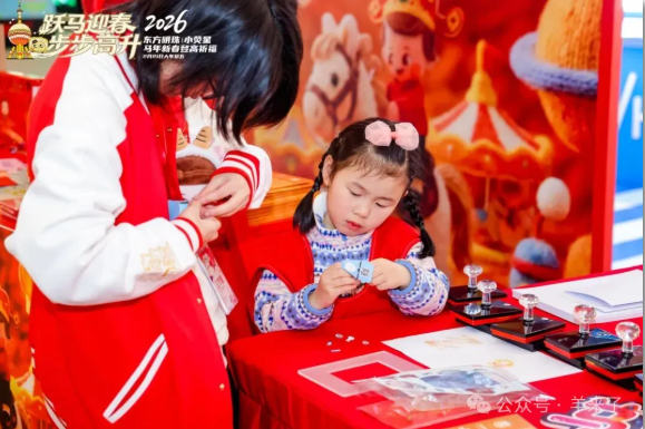 热闹的新春市集,恒源祥·小囡的“马织春程 福伴小囡”摊位温馨且富有节庆氛围。小囡鸿运套装、红灯笼、新年祝福牌、十二生肖折纸等装饰品随处可见,呈现出浓厚的春节氛围。小囡们不仅可以拿到生肖折纸、马年御守和新年红包等节日礼品,还能够参与多种互动活动,体验传统文化的魅力。